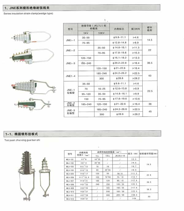JNE系列楔形絕緣耐張線夾,主要型號有:JNE-1,JNE-2,JNE-3,JNE-4,JNE-1拉板型,JNE-2拉板型,JNE-3拉板型,NEJ-101,NEJ-102,NEJ-103,NEJ-104,NEJ-205,NEJ-206,NEJ-307,NEJ-308,NEJ-409,NEJ-410,橢圓錐形掛板式耐張線夾