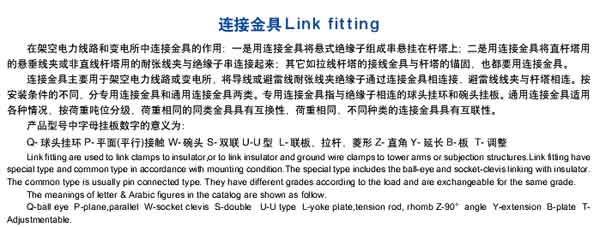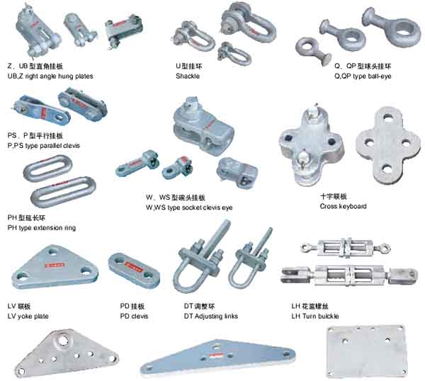主要有:聯(lián)板,調(diào)整環(huán),十字掛板,花蘭螺絲,球頭掛環(huán),碗頭掛板,U形掛環(huán),平行掛板,掛板。直角掛環(huán),加強形U形掛環(huán),拉環(huán),U型螺絲,支撐架。