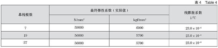 注 Note: LGJF型的計(jì)算重量,應(yīng)在上表內(nèi)規(guī)定值中增加防腐涂料的重量。其增值為:鋼芯涂防腐涂料者增加2%,內(nèi)部鋁鋼各層間涂防腐涂料者增加5%。 六、技術(shù)特性 1.鋁絞線及鋼芯鋁絞線的直流電阻符合表2及表3規(guī)定。 2.成品絞線表面應(yīng)光潔,不允許有過(guò)量的潤(rùn)滑油脂和與良好產(chǎn)品不相稱的缺陷,絞線中不允許有斷裂的單線。 3. 鋁絞線的彈性系數(shù)和線膨脹系數(shù)如表4