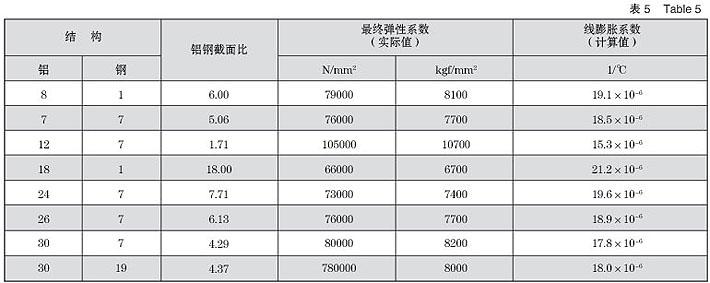 注 Note: (1) 彈性系數(shù)值的精確度為±3000N/mm2 (2) 彈性系數(shù)適用于受力在15%~50%計(jì)算拉斷力的鋁絞線。 4. 鋼芯鋁絞線的彈性系數(shù)和線膨脹系數(shù)見(jiàn)表5,不同結(jié)構(gòu)的鋁鋼截面比也列于表5