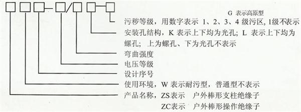表示戶外棒形支柱絕緣子、普通型、設(shè)計(jì)序號為1、110kV電壓等級、4kN彎曲強(qiáng)度、上下法蘭均為螺孔、用于I級污區(qū)。
