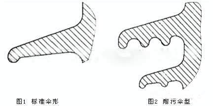 普通型絕緣子采用標(biāo)準(zhǔn)傘形(見圖1)。耐污型、耐重污型絕緣子采用經(jīng)人工污穢試驗(yàn)優(yōu)選的大小傘相間 、傘下帶棱的傘形( 見圖2 )。由于小傘處于大傘的保護(hù)之下不易受污染,且大傘間間距較大 ,改善了傘間放電特性,因而提高了絕緣子的耐污性能,并有利于帶電水沖洗。