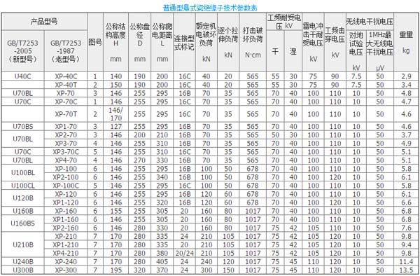 XP—以機(jī)電破壞負(fù)荷表示的普通型懸式瓷絕緣子;X—以一小時(shí)機(jī)電負(fù)荷表示的普通型懸式瓷絕緣子,其右下角數(shù)字為設(shè)計(jì)順序號,數(shù)字70、80、100、120、160、210、300為額定機(jī)電破壞負(fù)荷(KN);3、4.5為一小時(shí)機(jī)電實(shí)驗(yàn)的機(jī)械負(fù)荷(t),C—槽型鏈接(球形鏈接不表示)。