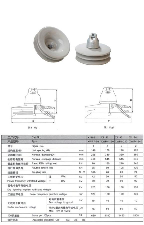 XP—以機(jī)電破壞負(fù)荷表示的普通型懸式瓷絕緣子;X—以一小時(shí)機(jī)電負(fù)荷表示的普通型懸式瓷絕緣子,其右下角數(shù)字為設(shè)計(jì)順序號(hào),數(shù)字70、80、100、120、160、210、300為額定機(jī)電破壞負(fù)荷(KN);3、4.5為一小時(shí)機(jī)電實(shí)驗(yàn)的機(jī)械負(fù)荷(t),C—槽型鏈接(球形鏈接不表示)。